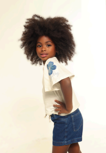 Acompanha uma blusa creme, com mangas bordadas em formato de flor e a frase “Happy Day”, trazendo um toque lúdico e alegre para o look.