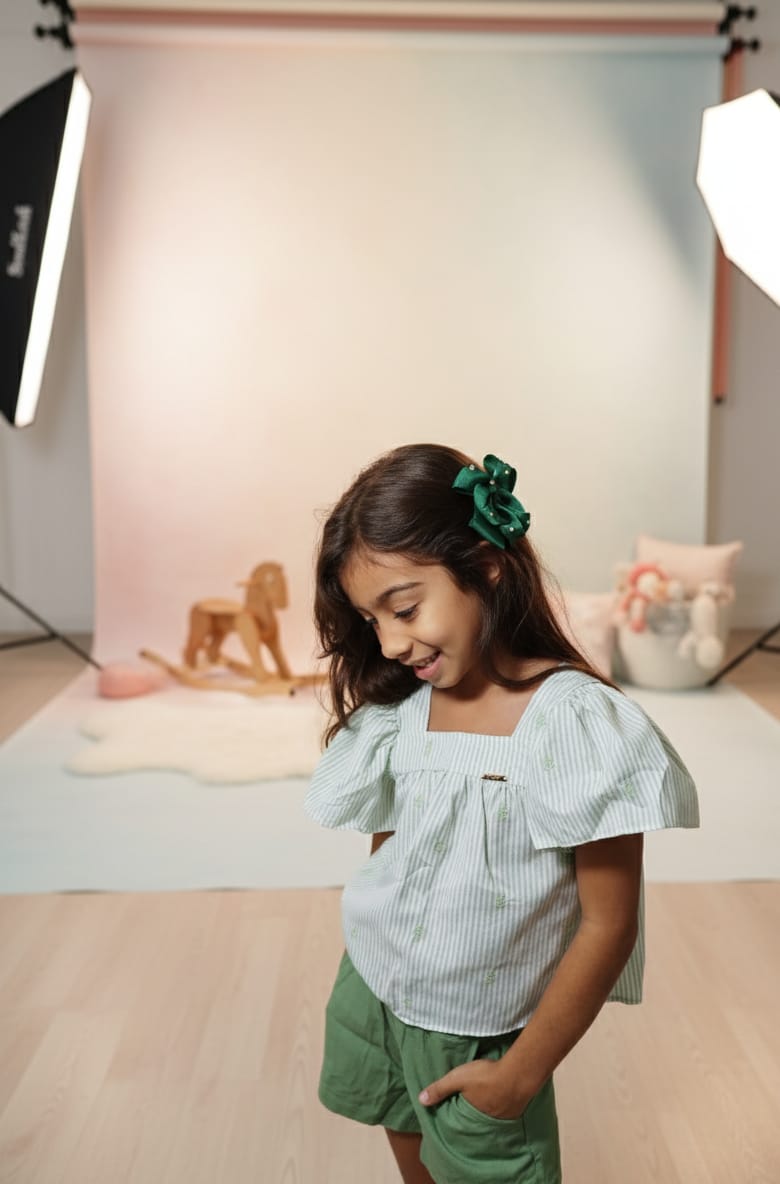 O short verde-claro com cós elástico oferece praticidade e liberdade para brincar com muito conforto. A combinação das cores suaves cria um visual harmônico e cheio de personalidade — perfeito para dias ensolarados, passeios ou ocasiões especiais. ☀️