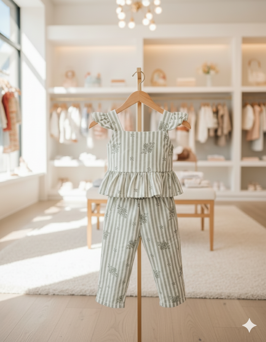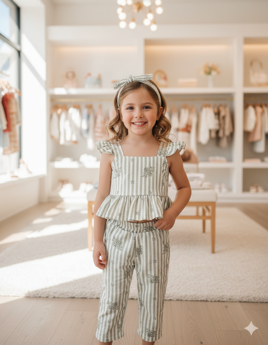 Delicado e encantador, o Conjunto Verde Sereno é confeccionado em tricoline 100% algodão, trazendo maciez, conforto e leveza em cada detalhe. Com listras suaves em azul e branco, aliado ao design moderno da calça e da blusa com babado delicado, o modelo transmite charme e elegância, perfeito para deixar sua pequena ainda mais graciosa.