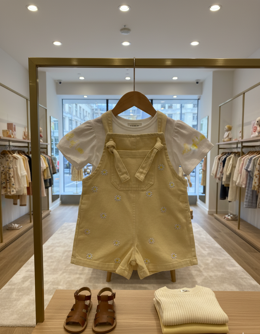 Encanto e delicadeza em cada detalhe! Este conjunto infantil premium traz a combinação perfeita entre estilo e conforto. A jardineira em tom amarelo manteiga suave possui design moderno, com amarrações frontais e bolsos funcionais, proporcionando praticidade e muito charme.