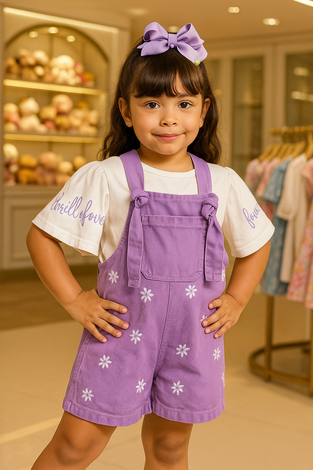 Encanto e delicadeza em cada detalhe! Este conjunto infantil lilás traz a combinação perfeita entre estilo e conforto. A jardineira em tom lilás suave possui design moderno, com amarrações frontais e bolsos funcionais, proporcionando praticidade e muito charme.