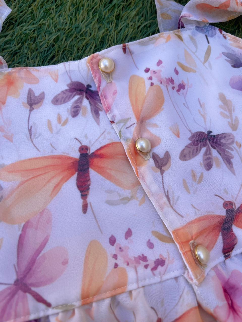 O Vestido Borboletas com Amarração é puro charme, com estampa delicada de borboletas coloridas e flores que trazem um toque alegre e romântico. As alcinhas com amarração garantem um ajuste perfeito e um visual encantador.